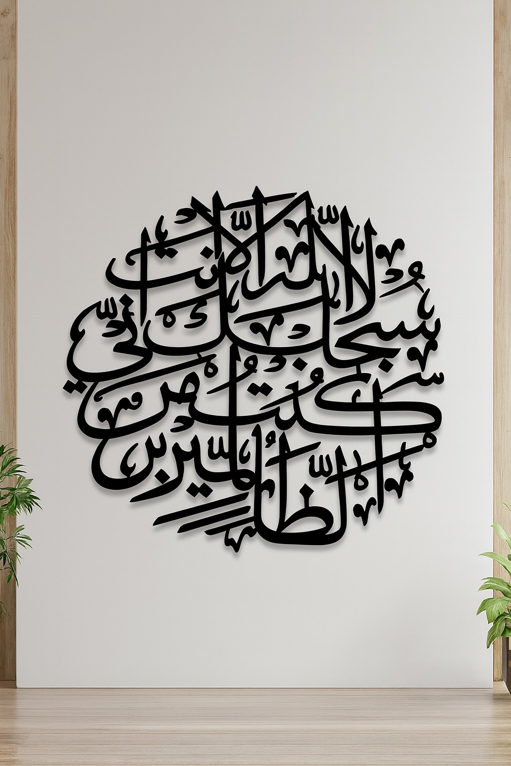 This sacred Ayat — “La ilaha illa anta, subhanaka inni kuntu minaz-zalimeen” — is a powerful dua of forgiveness and mercy. Designed in a modern circular calligraphy composition, this wall art is cut from premium black acrylic, delivering a striking 3D effect with clean edges and a refined matte-gloss finish.